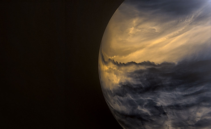 Japan’s Akatsuki probe, currently in orbit around Venus, examines the planet in infrared radiation and sees a totally different world. Beneath its clouds, Venus has a thick carbon-dioxide atmosphere, 90 times as thick as Earth’s, that produces an extreme greenhouse effect, heating the surface to a searing 850 degrees Fahrenheit. At this temperature, the surface glows brightly in infrared, like the lamp on night-vision goggles. What Ataksuki sees is therefore like a photographic negative, with all the usual notions of bright and dark reversed.