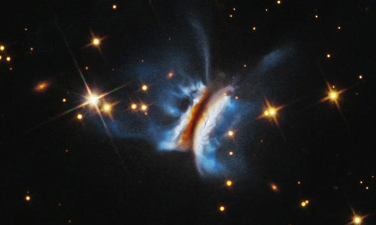 This image might look a bit like a radioactive hamburger floating in space, but you’re actually gazing at the biggest planet-forming disk ever seen around a young star. The disorderly disk has a diameter of almost 400 billion miles, or around 40 times the diameter of our entire solar system.