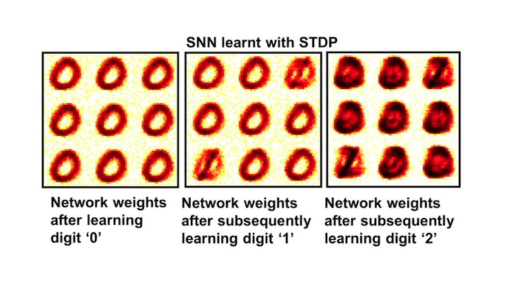 They fed it two sets of rules, or algorithms. One algorithm, known as spike-timing dependent plasticity (STDP), wasn’t designed to gradually forget information. When the researchers showed it three digits—0, 1, and then 2—the neural network remembered well, too well.
