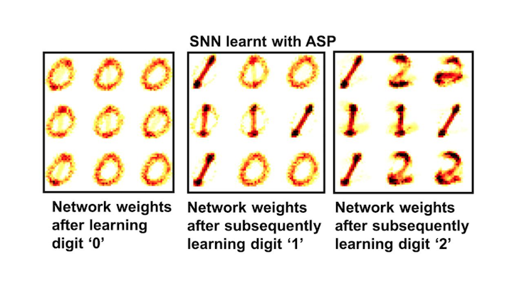 But the second algorithm, called adaptive synaptic plasticity (ASP), used SNO’s ability to remember and gradually forget information and was able to represent each successive digit with little trouble. ASP’s success was the result of balancing habituating and forgetting.