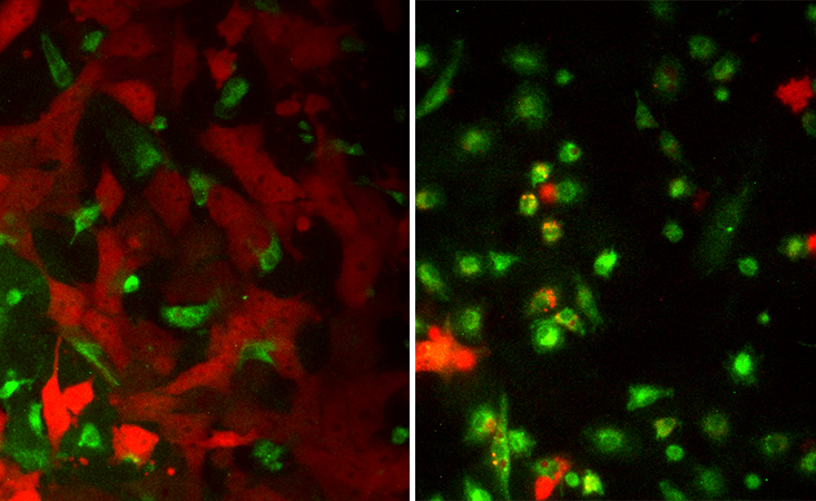 Egeblad and Adams teamed up to investigate how this combo would work on tumor cells taken from real patients. Adam’s team collected lung fluids from patients with breast cancer that had metastasized to the lungs and transported them to CSHL. Egeblad’s team extracted tumor cells and immune cells from the samples, treated them with the toxin-interferon combo and watched the immune cells waking up to the cancer’s presence. “We were able to turn them on to the tumor cells in the dish,” Adams says. “We reprogrammed them to kill the tumor.” In a recent study, the two teams showed that the toxin-interferon combo also suppresses tumor growth and metastasis in breast and ovarian cancer in mice.4 They hope to eventually try this in humans, too.