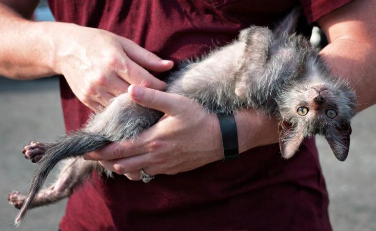 Looking at a Lykoi cat for the first time, one can be forgiven for thinking it might be sick. Lykois bear a mutant gene variation that interferes with their hair growth, robbing the animals of much of their undercoat and leaving them with hair follicles that are either unable to produce hair at all, or that can produce it but not maintain it. While they do have hair, it is sparse, and often missing entirely around the face and paws, lending Lykois a lean, slightly mangy look, with eyes that, unhidden by fur, give the illusion of being much larger than normal.