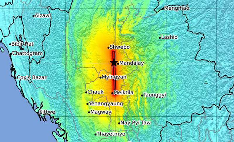 From what I’ve seen, the event is a pretty typical continental strike-slip event. It looks like a fault section of about 200 kilometers broke in a single event near Mandalay, and it mostly propagated to the south. It was pretty shallow, probably around 10 kilometers or so deep, and because the event is so large, it took about one minute to unfold itself and produced some pretty significant shakes. I’ve seen a lot of infrastructure damage, buildings and bridges coming down. [USGS has estimated that the quake ran along a fault section that lies 6 miles (10 kilometers) deep, 124 miles long and 12 miles wide.]