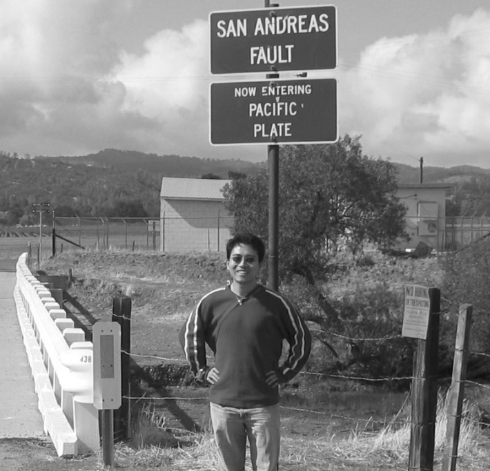 FAULT LINES: Zhigang Peng, a seismologist at Georgia Institute of Technology in Atlanta,  has studied quakes along the Alpide belt in southern Eurasia, one of the most seismically active regions in the world. Here he stands beside the Pacific plate of the San Andreas Fault, an 800-mile slip-strike fault that runs from the Bay Area to the Salton Sea. The San Andreas Fault was responsible for the 1906 San Francisco earthquake, which killed an estimated 3,000 people and left half the city homeless. Photo courtesy of Zhigang Peng.