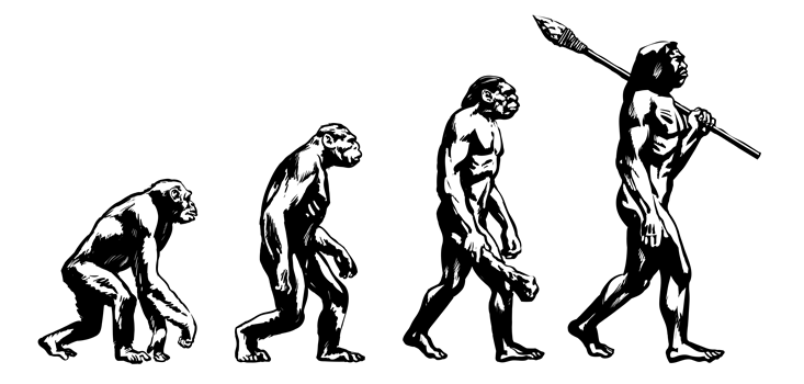 The image of a chimpanzee turning into a human that we see on T-shirts may not be how this all unfolded.