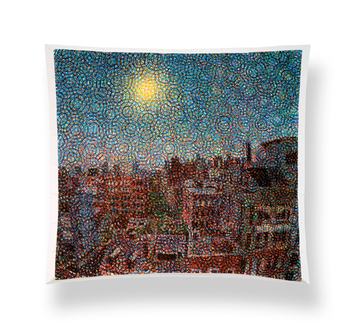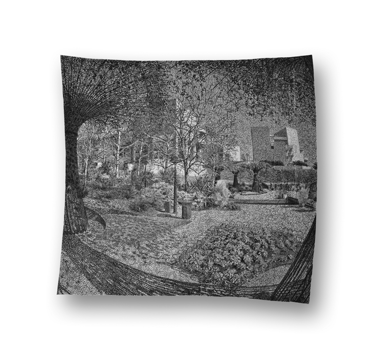 Late last summer, I had the most unexpected breakthrough. Beth Jacobs, a member of the New York Academy of Sciences’ Board of Governors, invited me and some friends to her New York City apartment to meet the Oakes twins, artists who have gained attention in recent years for their drawings as well as the innovative technique and inventions they deploy to create them. An Oakes work, Irwin Gardens at the Getty in Winter (2011), an intricate drawing of the famous gardens designed by Robert Irwin at The Getty Museum in Los Angeles, was displayed on the balcony of Jacobs’ apartment overlooking Central Park, with the backdrop of the New York City skyline lit with a warm orange sky moments before sunset.