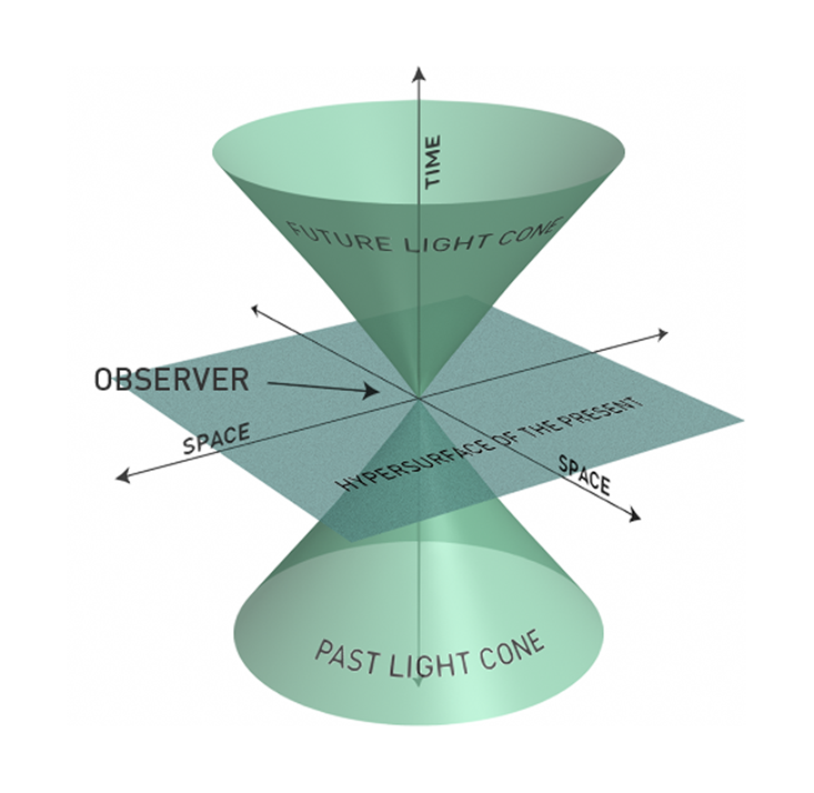 This has consequences for light. In the figure below we see that light is no longer a point in space, but rather a cone in spacetime.