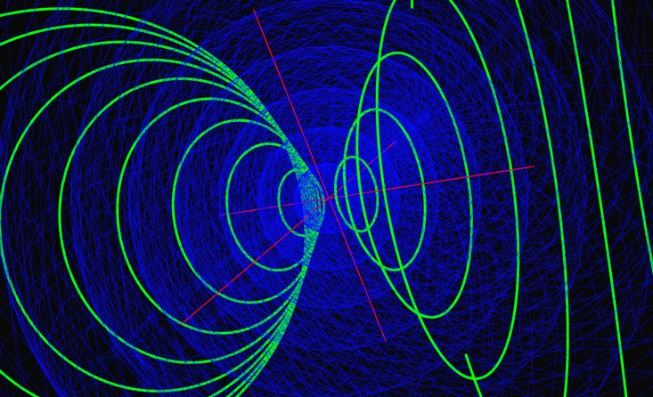 A ray of light is a manifestation of four-dimensional spacetime. The equation for this light cone is well known: X2 + Y2 + Z2 - c2T2 = 0. This equation is so beautiful that it’s worth saying a few words about it. Realize that the left hand side of the equation depends on three spatial directions (X, Y & Z), time (T), and the speed of light (c). If we were to ignore time, this is the equation for a three-dimensional surface. The inclusion of the time direction makes an equation that describes a light cone as depicted in the figure above. Below is a computer-generated snapshot of the spherical waves tracing out the different points of the light cone emanating from its point of creation. The blue regions represent the time development of the spherical waves.