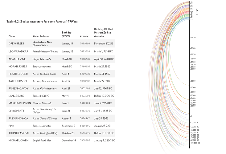To test this, Boxer created a data-dump of historical Z-codes. From 10,000 B.C. to today, Boxer calculates, there has been a total of 30,180, 228 “distinct astrological moments.” It is surprising how rarely they repeat. For instance, the last time someone with the actor Heath Ledger’s Z-code appeared on Earth was in the year 1362 (they were born on March 31). Boxer’s own Z-code last appeared on May 20, 2669 B.C., when Imhoptep was building Egypt’s first pyramid. An unfortunate who was thrown to the lions, as documented in Vettius Valens’ second-century A.D. Anthologies, has shared a Z-code with no one since: The next person with that code will be born on March 30, 3328.