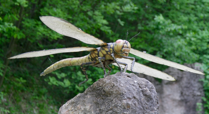 Remember how evolution sometimes has unforeseen consequences? Well, this deposit of lignin produced an oxygen surge in the atmosphere. Because for every hydrocarbon atom that goes into the Earth, an oxygen atom is not used up in the decay process. Massive amounts of carbon (lignin) were going into the Earth, so massive amounts of oxygen were building up in the atmosphere. Today, oxygen is 21 percent of the atmosphere. But around 300 million years ago, oxygen was well over 30 percent. There was so much oxygen that insects, who have very inefficient ways of breathing, were able to get huge. Dragonflies had a wingspan of three feet, millipedes were eight feet long. Amphibians—frogs and such—also have inefficient lungs, and they were able to get as big as dining room tables.