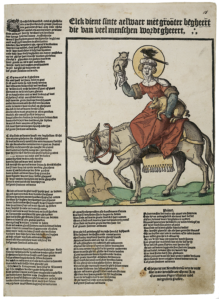 In 16th-century Holland an evil cat appeared in the company of a curious anti-saint known as “Saint” Aelwaer. A satirical image meant to display attributes that were the exact opposite of the qualities of the Virgin Mary, she was described as a “demonic patroness of all tribulation.” In a Dutch woodcut of 1550 she is portrayed riding a donkey, with a magpie on her head symbolizing immorality, a pig under her left arm symbolizing gluttony, and a cat held aloft on her right hand symbolizing the forces of evil. The cat is held high, like an emblem or ensign that is clearly meant to advertise the fact that this figure is in league with the Devil.