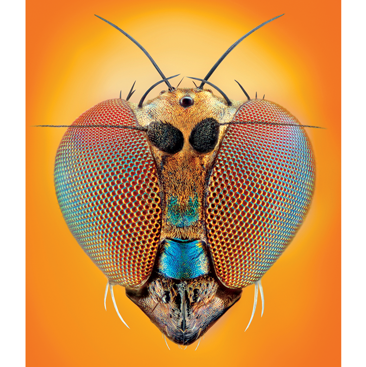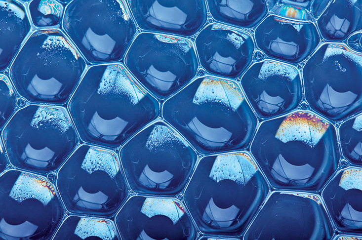 The rules of cell shapes in foams also control some of the patterns seen in living cells. Not only does a flyâs compound eye show the same hexagonal packing of facets as a bubble raft, but the light-sensitive cells within each of the individual lenses are also clustered in groups of four that look just like soap bubbles. In mutant flies with more than four of these cells per cluster, the arrangements are also more or less identical to those that bubbles would adopt.