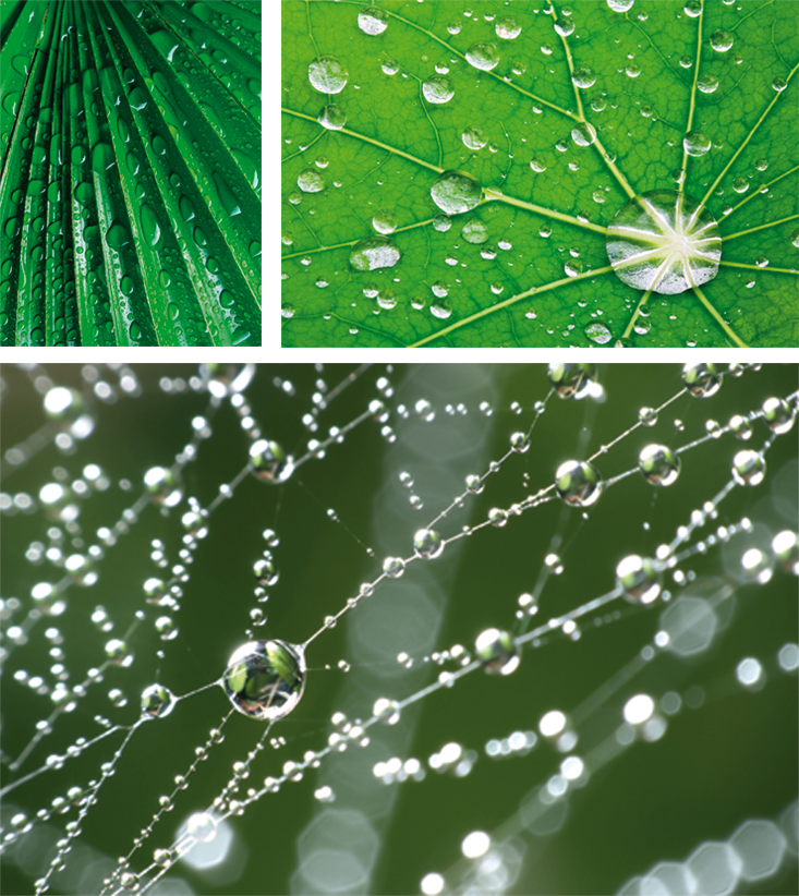 What determines these rules of soap-film junctions and bubble shapes? Nature is even more concerned about economy than the bees are. Bubbles and soap films are made of water (with a skin of soap molecules) and surface tension pulls at the liquid surface to give it as small an area as possible. Thatâs why raindrops are spherical (more or less) as they fall: A sphere has less surface area than any other shape with the same volume. On a waxy leaf, droplets of water retract into little beads for the same reason.