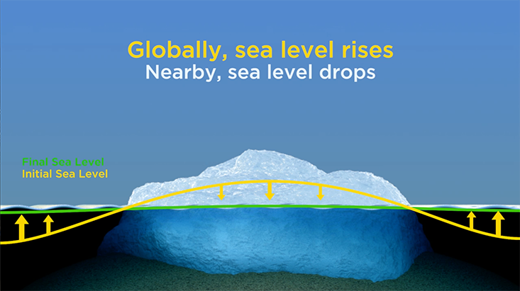 Three things happen. One is that you’re dumping all of this melt water into the ocean. So the mass of the entire ocean would definitely be going up if ice sheets were melting—as they are today. The second thing that happens is that this gravitational attraction that the ice sheet exerts on the surrounding water diminishes. As a consequence, water migrates away from the ice sheet. The third thing is, as the ice sheet melts, the land underneath the ice sheet pops up; it rebounds.