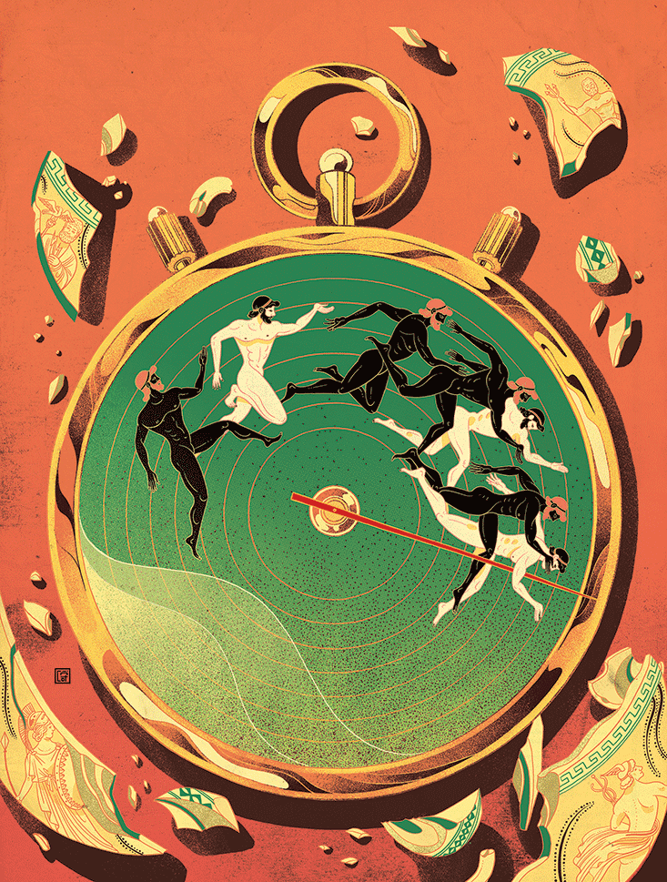 And the men’s and women’s foot races at today’s Olympic Games? The runners, representing some 200 different nations, are racially, ethnically, and religiously diverse. None, to the best of my knowledge, is a slave—except to the nearly incredible demands of modern scientific training. In order to compete, ancient Olympians had to pass scrutiny by religious authorities known as hellanodikai. Modern Olympians become eligible when they are selected by National Olympic Committees that have been officially recognized by the International Olympic Committee. The runners, who are most definitely not naked, wear spiked shoes scientifically designed to maximize performance. The length of the race is measured in meters, which are defined as the distance traveled by light in a specific fraction of a second. The standardized 400-meter track measures 84.39 meters for the straights and 115.611 meters for the curves. Each lane is 1.22 meters wide. The starting blocks, which are not blocks, are electronic devices that make it utterly impossible for a runner to successfully “jump the gun. ” Races are timed to the hundreths of a second. Aristotle, who compiled a list of ancient Olympic victors, would have categorized this modern mania for price quantification as a psychic disorder.