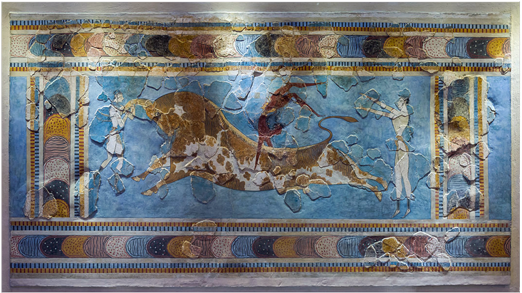 So it was with the Minoan culture of ancient Crete. In a damaged, hard-to-interpret fresco found in the Palace of Knossos in the town of Heraklion, girls (painted white) boldly grip the horns of a huge bull or wait to catch the boy (painted red) who is in flight over the bull’s elongated back. It is possible that the painted figures represent acrobats performing for the amusement of the court, but it is more likely that their sport was part of an intiatory ordeal or a fertility ritual. We cannot be sure because the palace is a ruin and the sport vanished millennia ago.