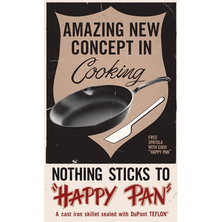 PTFE began its trajectory to our kitchens in 1945, when the Teflon trademark was registered by Kinetic Chemicals, a collaboration between DuPont and General Motors. Not long after, Kinetic Chemicals began churning out more than 2 million pounds of Teflon per year. New versions of PTFE soon emerged that were easier to mold or extrude, and its commercial appeal continued to grow. In 1961, the first Teflon-coated skillet, known as the Happy Pan, hit the U.S. market.