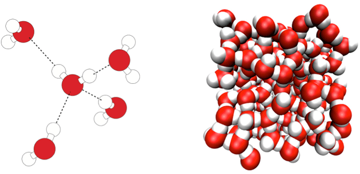 One of the simplest theoretical models of water treats hydrogen bonding as purely electrostatic: an attraction between slightly positively charged hydrogen atoms and negatively charged “lone pairs” of electrons on the oxygen atoms of neighboring molecules, with these charges disported at the corners of tetrahedra. This attraction, dictating a particular geometric arrangement of molecules, operates on top of the more general attraction that all atoms and molecules feel for one another owing to the sloppiness of their clouds of electrons, called van der Waals or dispersion forces. In simple liquids such as liquid argon or carbon dioxide, it’s just the van der Waals forces that keep the molecules from flying apart into vapor.