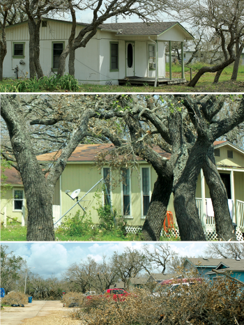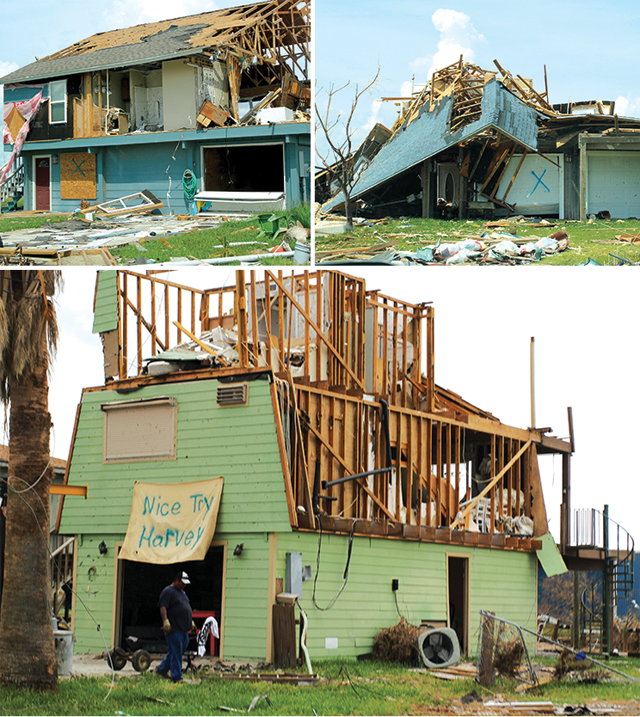 Our findings led us to consider a variety of factors—such as vegetation, location and structural integrity—that might account for the discrepancies among damage scores within each hurricane zone. Our observations indicate that thick vegetation, such as trees and shrubs, provided buildings and homes with a degree of protection from hurricane-force winds by acting as windbreaks. Damage to structures surrounded by thick vegetation was considerably less compared to structures in the same community that were not surrounded by such barriers. For example, the town of Fulton, which is just north of Rockport and is surrounded by dense brush and trees, sustained less damage than Rockport, which has no dense brush or tree cover, even though both are located on Aransas Bay and were hit with Category 4 winds.