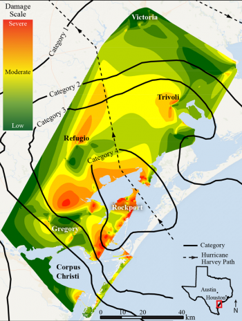 To quantify the damage caused by Hurricane Harvey, we created a scale based on our observations that scored the severity of damage from 1 (minor) to 5 (severe). In general, a score of 1 was given for no damage, a score of 2 for missing siding or roofing with minor holes, a score of 3 to structures with large holes in the roofing or siding, a score of 4 to partially collapsed structures, and a score of 5 to completely collapsed structures. A random sampling of structures within a designated area were assigned damage scores, and these scores were then pooled to calculate an average damage score for that area. In total, we assigned scores to 658 structures, which we used to create a map of localized damage across the region. On our map (to be published in a USGS Open File Report), areas that experienced the most severe structural damage corresponded with Harvey’s path. But the distribution of damage was not symmetrical along the path; instead, it was concentrated to the west and southwest of the hurricane’s path. To account for these variations, we added data from the National Weather Service about maximum wind gusts to our damage map and found that the damage correlated with hurricane category contours.