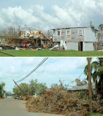 On our way to Rockport, we saw an increased number of utility poles knocked down and more tree debris scattered about the streets. Throughout the Rockport area, palm trees were snapped in half, structures were missing their roofs, and homes—small and large, new and old—were flattened and torn apart. It was impossible to tell where all the scattered roofing and siding debris had originated. It was heart-wrenching to witness people returning to damaged homes to gather their destroyed belongings. One resident of Rockport reported that “the eaves in the front of [the] trailer were peeled away and the drywall was pushed in, leaving gaping holes where water and debris could come in. The wind shifted [the] whole trailer, ripping away gas and water lines, all of which caused structural damage.” The home was condemned and many of the person’s belongings were lost.