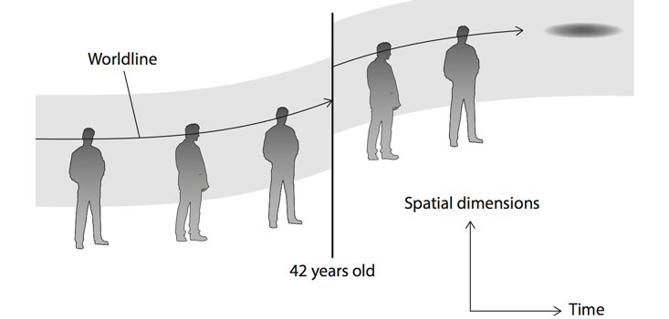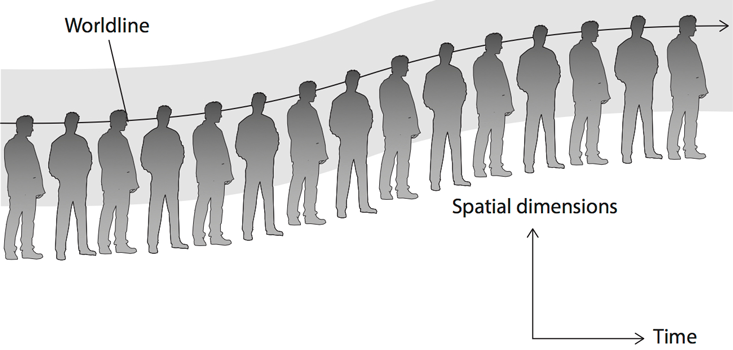 What could the missing ingredient be? Think about your own existence in space and time. When you go out to get the mail, you move from one spatial location to the next, tracing a path in space. A spacetime diagram can help us visualize the path one takes throughout one’s life. Collapsing the three spatial dimensions into one (the vertical axis) and taking the horizontal axis to signify time, consider the following typical trajectory: